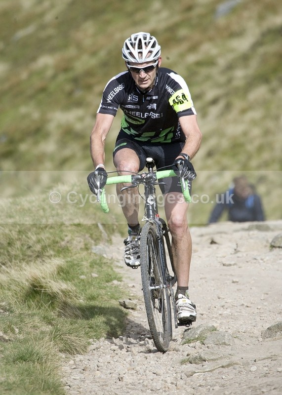 Penyghent was actually a bit harder than last year on the bottom part of the climb, and almost all of that was down to swinging round into the northerly wind again. I was pretty much on my own all the way up the climb and got into a good rhythm, but twinges of cramp flickered down both thighs by the summit. The cold wind on the legs didn’t help, but it soon went away. I had the descent to come now. Yay. Oh no … no brakes. Boo. A wind on the first rocky section actually helped slow me, but the steepest bit of the descent was pure hell. One brake, resurfaced fast track, and riders coming up. I was reduced to yelling “GET OUT OF THE WAY” at the top of my voice and somehow managed to check my speed by going into a boggy bit at the side of the track. I was really shaken up, but stayed on the bike. Going fast on bits like that is paradoxically slower. I was so worried for a minute or so that I got off my bike and jogged down a bit that would’ve been fine to ride.