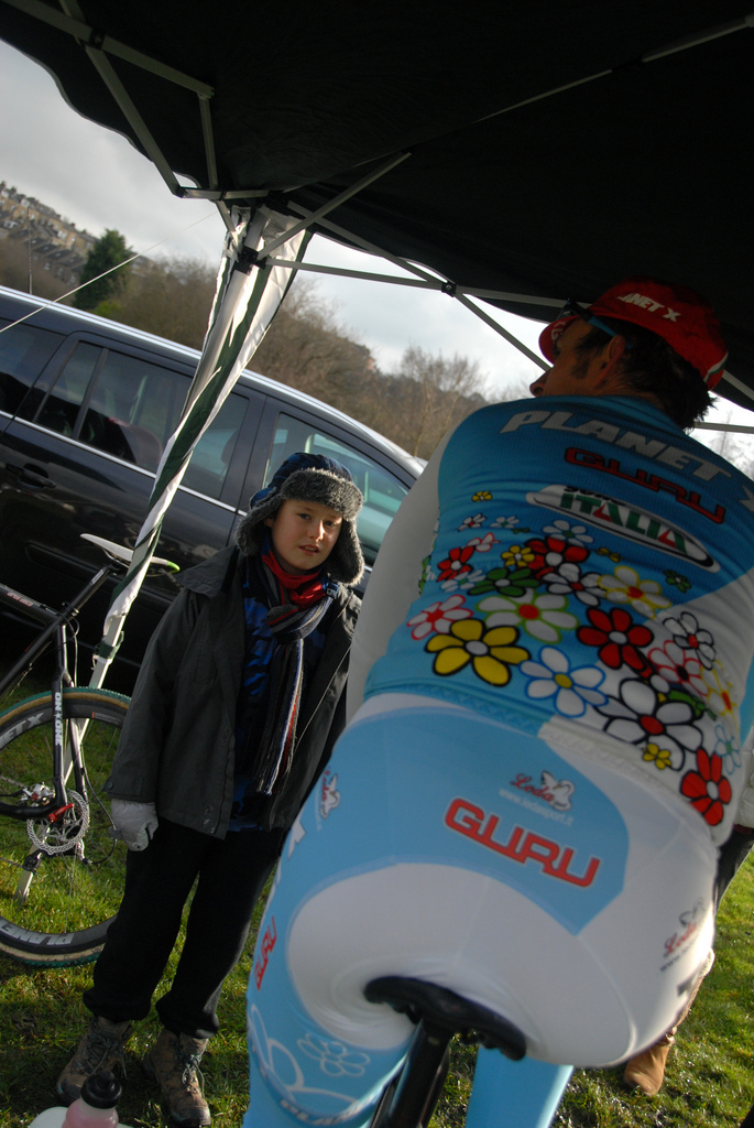 Easy get up. Afternoon race. Bags of time. Gentle drive. Over-hydrated. Need pee. Stop at services. Easy drive. Need pee. Stop at services. On to venue. Race under way. Atmosphere building. Erect gazebo. Text Alan. Prepare turbo. Take photos. Check tubs. On to course. Surprised at cambers. Say hello. Greet people. Sign on. Back to car. Rest. Eat sandwich (cheese). Eat cake (fruit). Pin number. Wrap up. Onto turbo. Spin to keep warm. Spin to warm up. Biting wind. Mum, Phil Angus arrive. Hugs. Feel excited. Prep was fine.