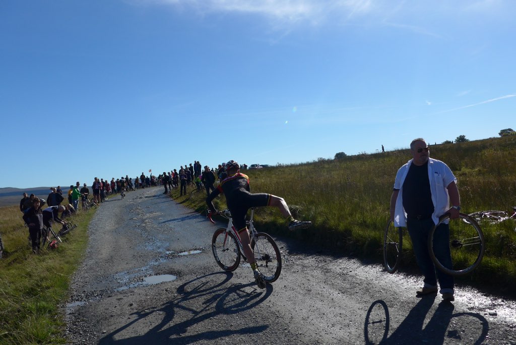 So, from heading towards a nudge at the top 20, I was now forty something-th, and so aghast that I only really made time for a quick swig of fluid on the important road section down to Horton. That was a daft error and shows how things compound when the lid comes off. I hit the Penyghent climb full of the wrong type of adrenaline and more bad news was waiting round the corner. I saw Alan for planned bike-change. It turned out that my skirmish over the bars on Ingleborough had caused a bit of bruising to either shifter or cable housing and I was down to two gears – Big Ring or Little Ring. Luckily, on Penyghent, that’s not as poor a choice as it sounds. I was able to spin in my bottom gear when I needed to, and up it a little to the big ring when I needed a bit more speed and things flattened out. But I wasn’t making any headway even into the riders who’d been way behind me on Whernisde – and I took a slightly-too-late gel and drink to try and put things right.
