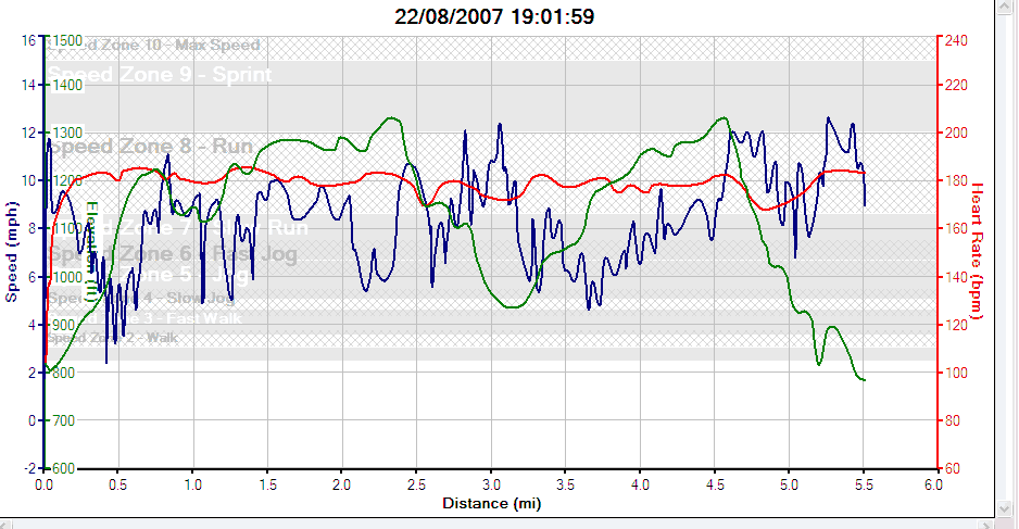 What amazed me though was it’s the first running race I’ve done since I got my new Garmin 305 GPS and Heart Rate Monitor. Just glancing down at my heart rate throughout the race made me ralise how I seem to run bang on the limit all the time. The result is that accelleration, or indeed any kind of pacing strategy is unachievable… I’m literally recovering and just getting by all the way through. (see image left – the Heart Rate is red on the graph – the green is the terrain (Heart rate hardly drops at all whether climb or descent).